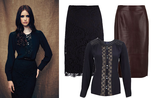 The Neo Goth trend was popping out across designer spectrum at LFWAW12. If you’re not keen on taking it to the extreme; then mix leather with lace for a dark, secretive look thats sumptuous and stylish. Black is key, but soften it up with our favourite; the berry leather pencil skirt.