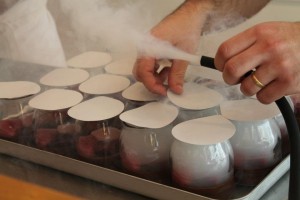 A few of us brewed infusions, others created a masterful chocolate ganache, and some poor souls peeled grapes. The infusions I worked on had lapsang souchang, coffee, tobacco, liquorice bark, and peppercorns in. The smell was absolutely phenomenal, and I was intrigued to see tobacco being used. Quite frankly, readers, I lost track of what went into the pud. There were so many different processes all going on at one time, it was nearly impossible to keep up! Tim used a top notch futuristic blender to prepare grape jelly, and set about creating a foam, and a delicately flavoured cream. Then the really intriguing part started. Tim produced a strange implement with ‘The Smoking Gun’ emblazoned on the side. We all watched, transfixed, as he poured wood chip into the top, and lit it. A haze of smoke began to sputter out, carrying the rich tinge of bonfires, Cornish cottages with smoking chimneys, and childhood campfires with it. The smoke was directed into the little glass pudding pots, before they were sealed with a lid that was ironed on.