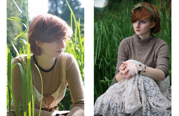 “I was feeling very inspired by early Autumn - so I chose a rust and bark palette of colours with lacy additions. The day started out beautifully and gradually progressed to stormy, providing an interesting array of background colours and lights throughout. There were ominous drops of rain every now and then, but thankfully it held off. The first outfit is made up of a thrifted Laura Ashley jumper dress, a thirties lace camisole I’d bought the day before at a local ‘flea market’ (£5!), and my favourite seventies belt. The skeleton leaf necklace was given to me by my grandma and the lace up heels were for christmas.”