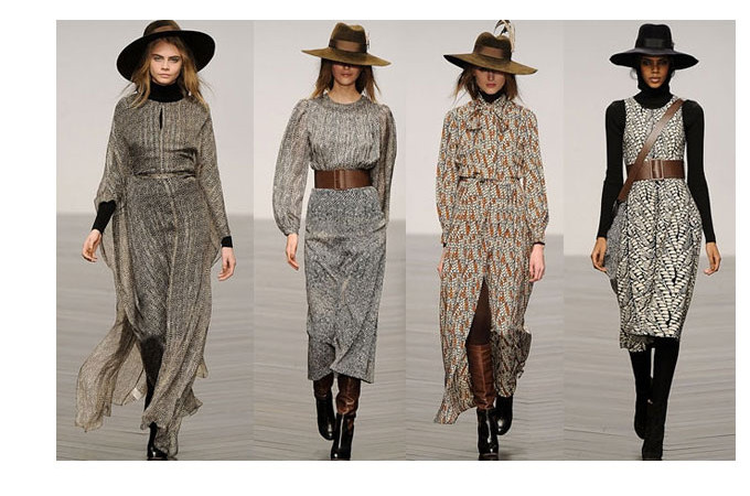 This season long sleeved polo necks are worn under dresses. Necklines are high (we saw this at Mulberry too) and sleeves are long. The models wore knee high boots from Aquazzura that worked so well with the long dresses. Materials flowed loosely but were cinched at the waist with brown leather belts. Silk chiffon kaftans printed with majestic eagle feathers, embroidered with plumes and beaded fringe gave a sense of power from the warrior tribes they had been inspired from. There is depth to these pieces, you can feel the mystic.