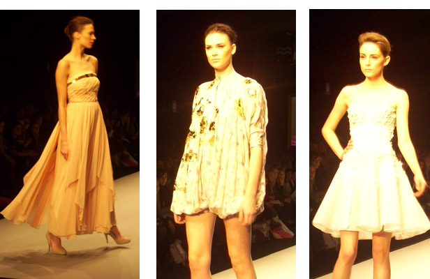 A host of sorbets, pastels, bringing the girly back for spring/summer with some lovely silks, laces and a touch of pleated lace on the collar. There was a flash of Victoriana ruffle, some spectacular neckwear. Featured outfits from Herve Leger, Jaeger and Jasper Conran. My favourite part of this trend; nude shoes. All the models had the same shoes. Something I always think can set off the runway in style. Plus some soft coral mixed with gold trimming and some fabulous floral hair pieces.